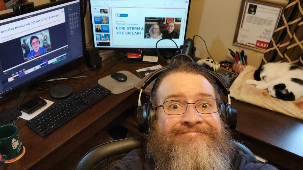 “Richard Fife on the Guest of Honor/Special Guest Displays team rendering videos up to the last minute, kept company by his cat, Éowyn.” (Photo taken off-site, not at the Hyatt)